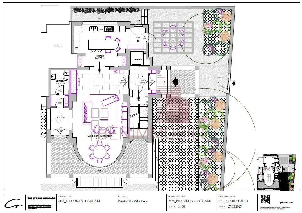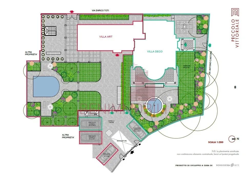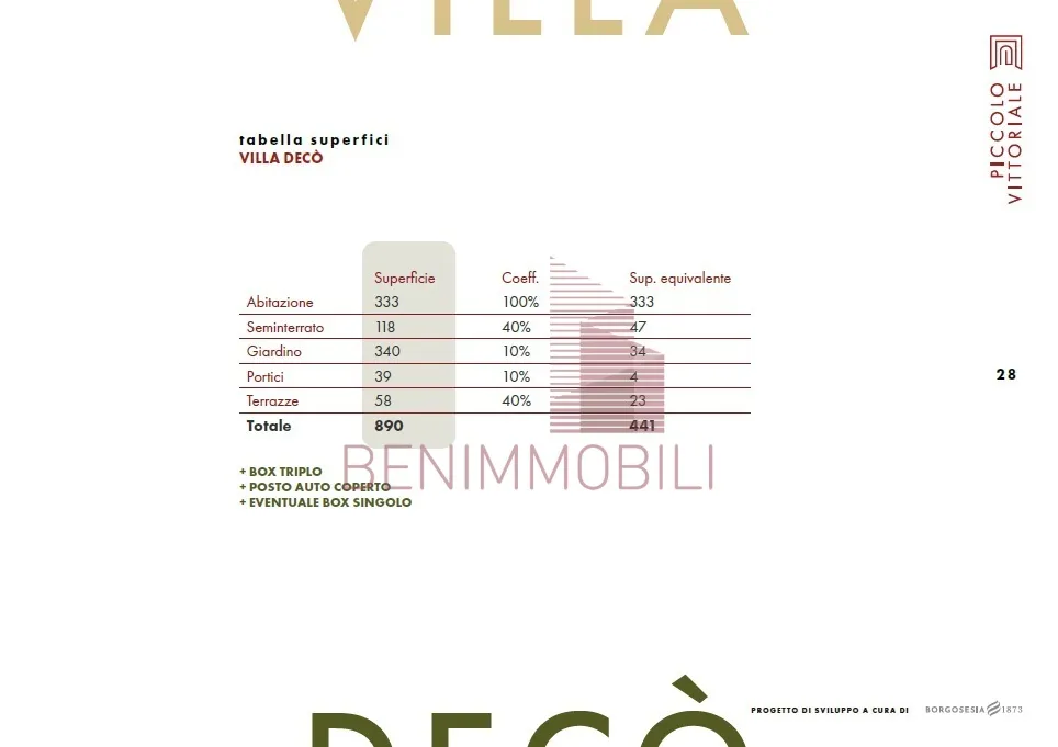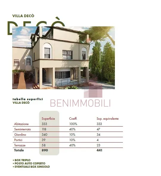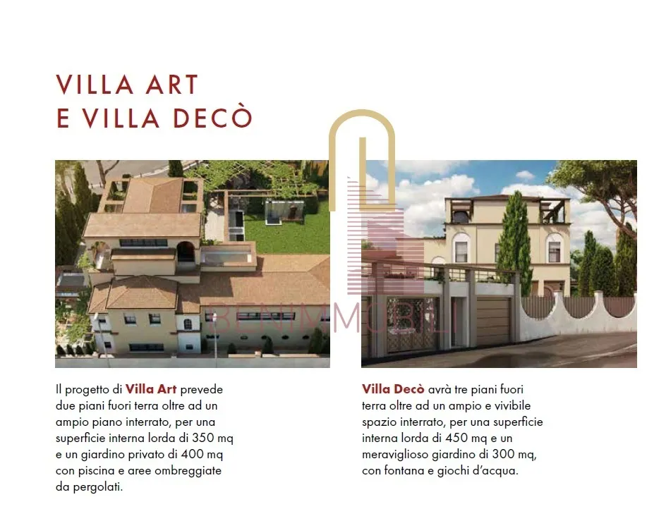 "Villa Decò" avrà una superficie interna lorda di 450 mq distribuiti su tre piani fuori terra serviti da ascensore privato ed un ampio spazio interrato. Godrà di un giardino privato di 300mq con fontana scenografica e garage triplo.