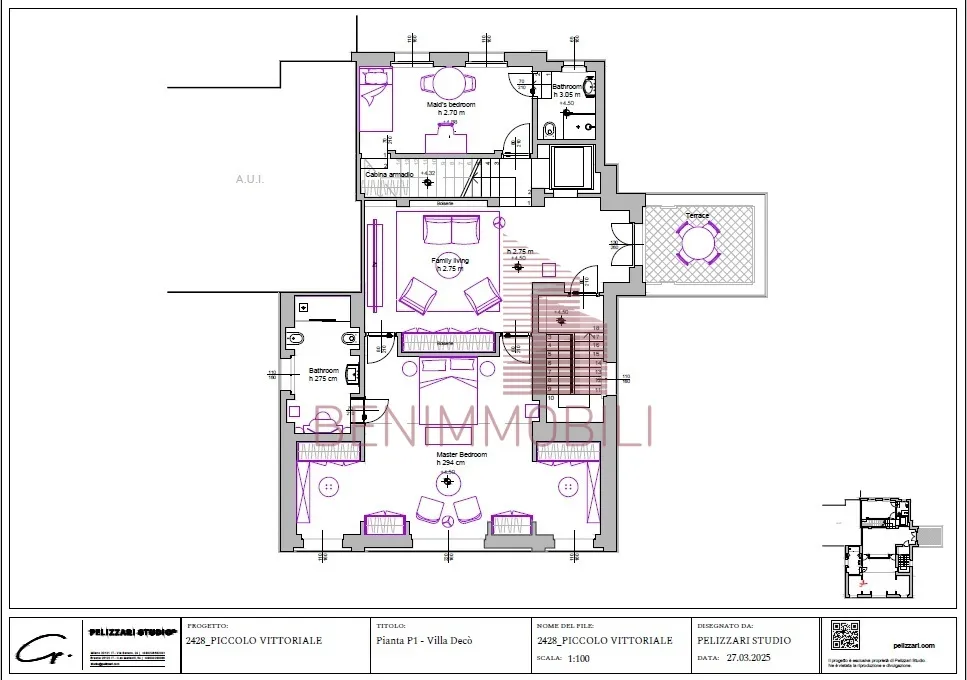 Piano Primo: zona living da adibire a salotto privato, camera matrimoniale padronale con proprio bagno en suite e cabina armadio, due camere doppie servite da un ulteriore bagno ed ampia terrazza.